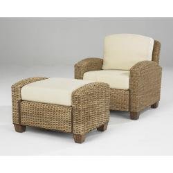 This cabana banana chair and ottoman provides casual comfort with an island inspired style. It's constructed from both sustainable mahogany hardwood and woven banana leaves in a honey finish. Protected by a clear coat finish helping to protect against wear and tear from normal use. The upholstered cushions feature ecru covers easily coordinating with many decorating schemes. frames are hand woven of natural banana leaves with no harmful additives. The furniture legs are made of natural renewable wood. Use any commercial upholstery cleaner for cleaning fabric. Chair measures 36-inch width by 29-3/4-inch depth by 31-3/4-inch height and ottoman measures 33-inch width by 21-inch depth by 22-3/4-inch height.